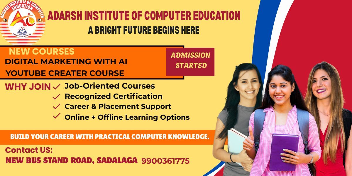 Adarsh Institute Of Computer Education. It established 1 October 2013. ADARSH Institute of Computer Education Centre is one of the oldest Computer Centre in Sadalaga providing Computer Software, All Soft Skills, Professional Courses, and Hardware and Software Courses.